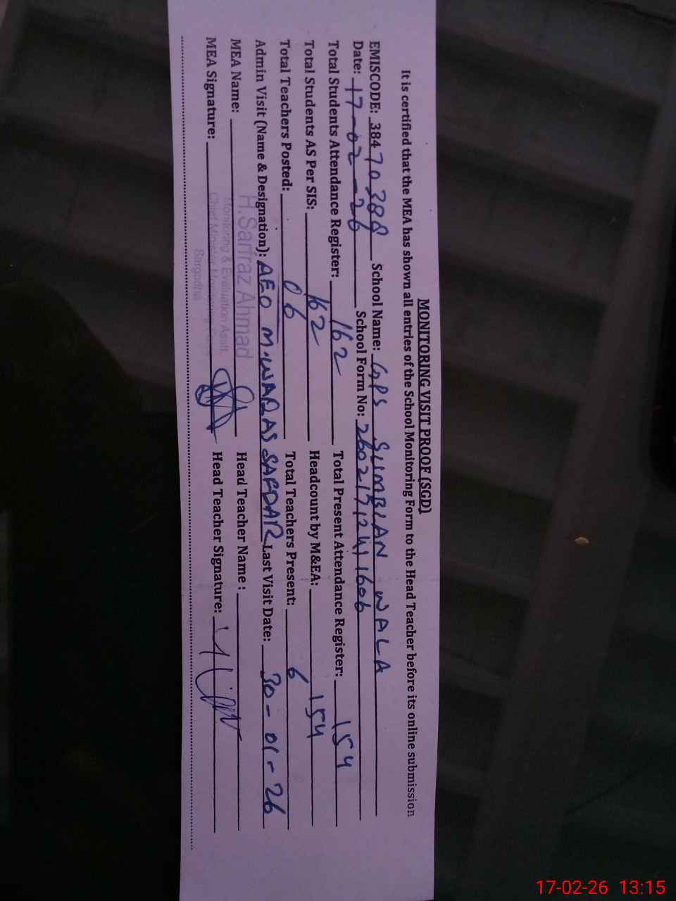 | Attendance Register | Head Teacher | MEA with School | Visit Proof |