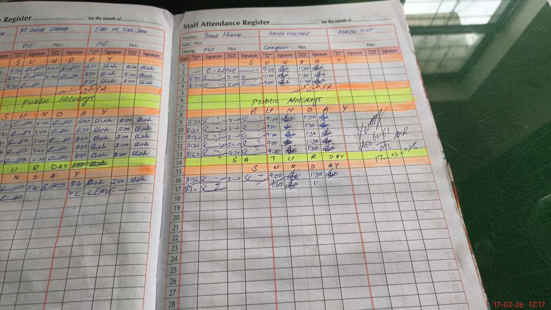 | CNIC | Full Name | Designation | R/C | Absence During Last Calender Month |