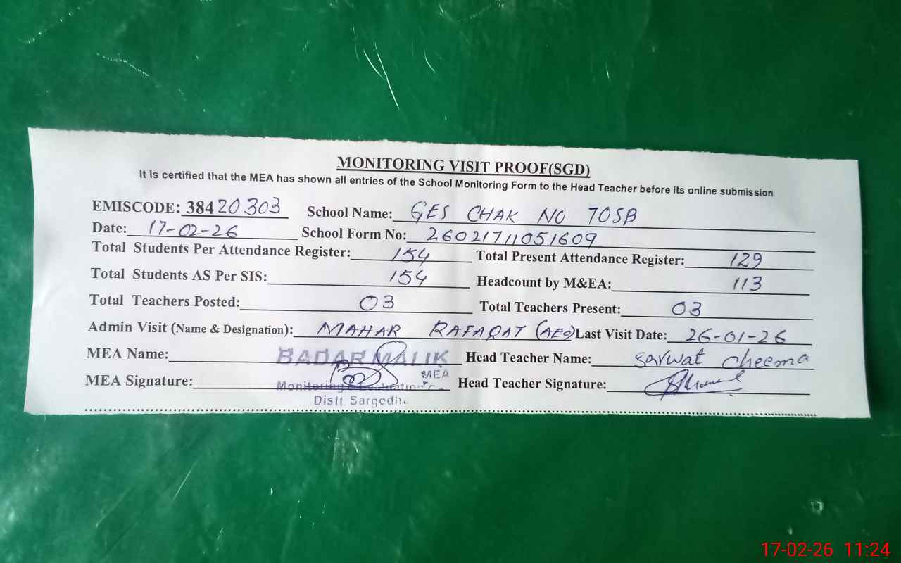 | EMIS Code: 38420303 | Name of School: GES CHAK NO.70 SB | |||