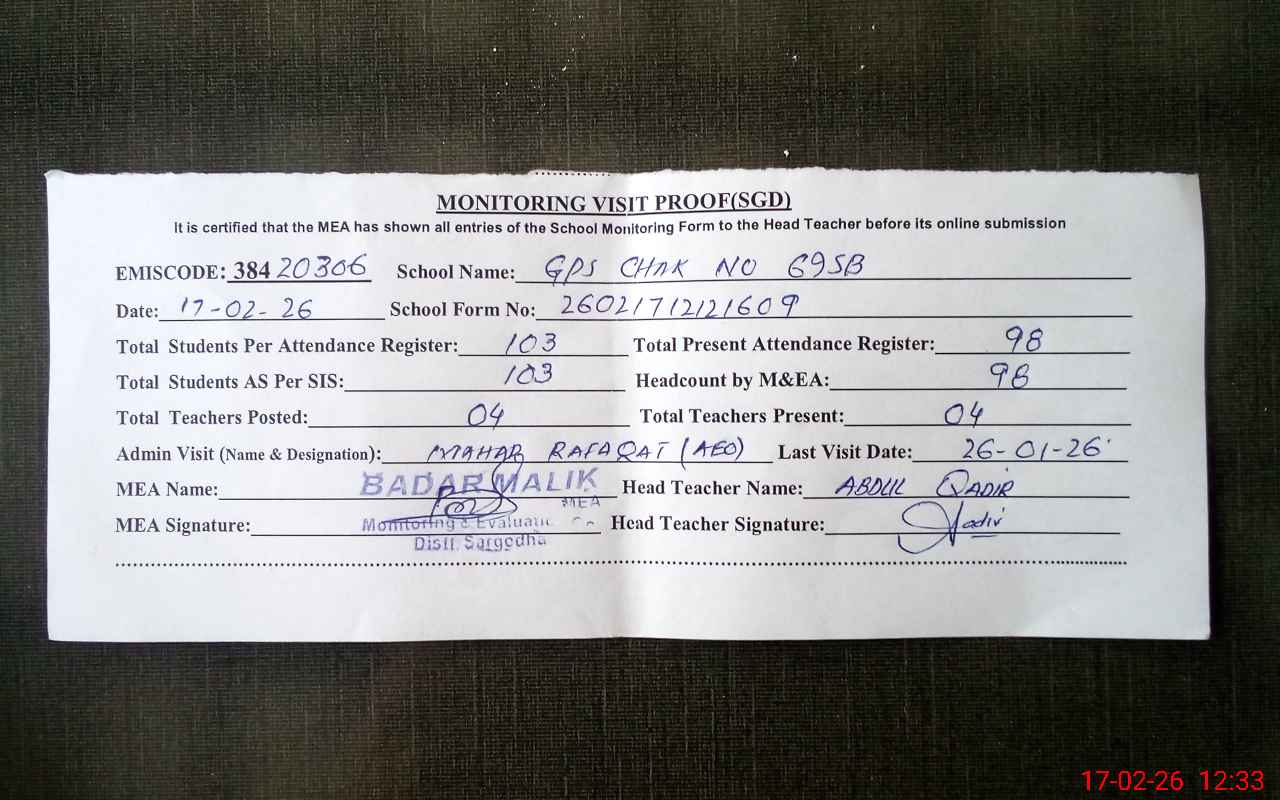 | EMIS Code: 38420306 | Name of School: GPS CHAK NO.69 SB | |||