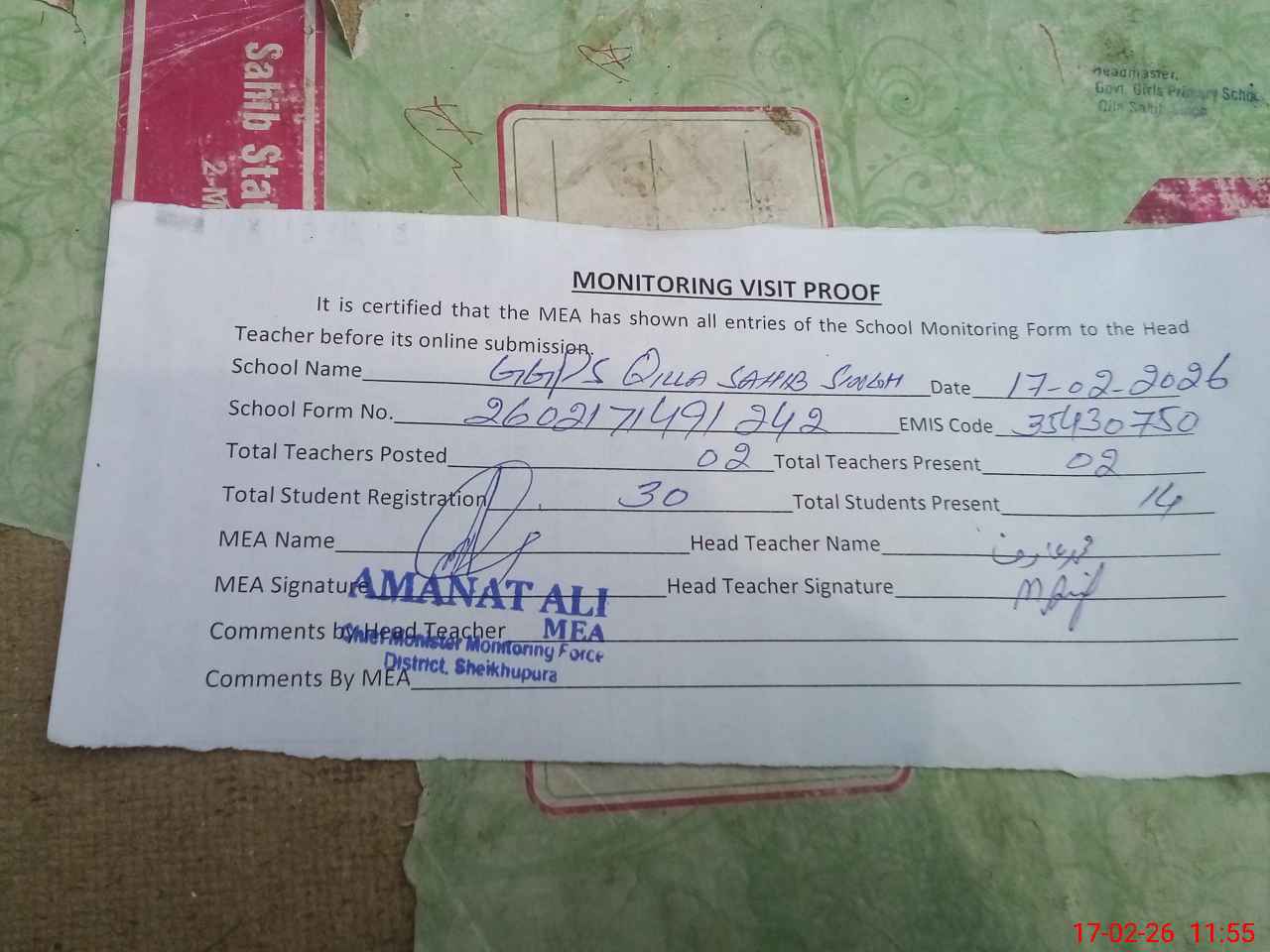 | Attendance Register | Head Teacher | MEA with School | Visit Proof |