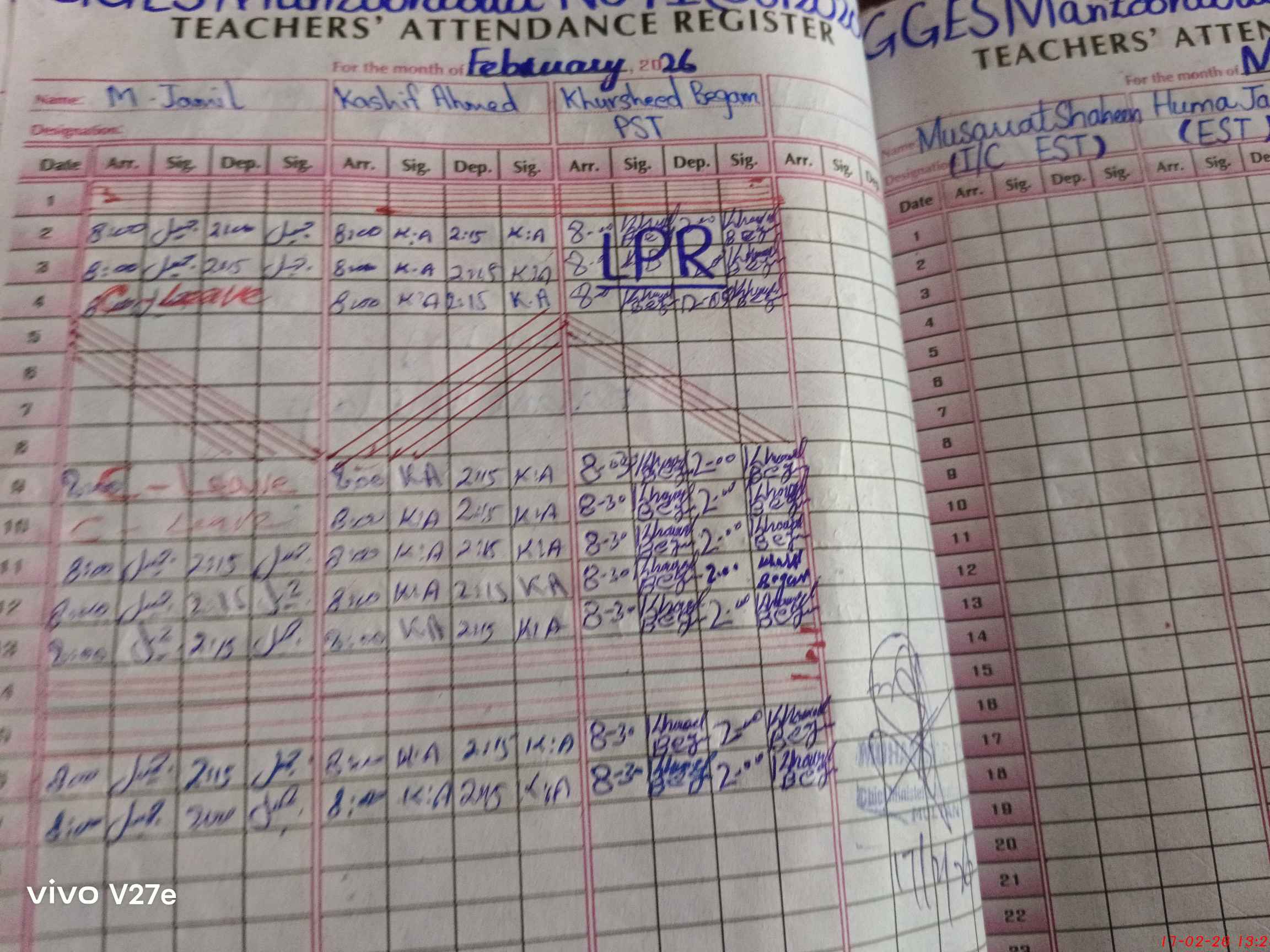 | CNIC | Full Name | Designation | R/C | Absence During Last Calender Month |