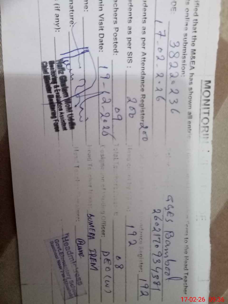 | Monitoring Date: 17-02-2026 | Start Time: 17-02-2026 09:22 AM | End Time: 17-02-2026 09:40 AM | Name of MEA: HA**** GH**** MO**** UDDI**** | |