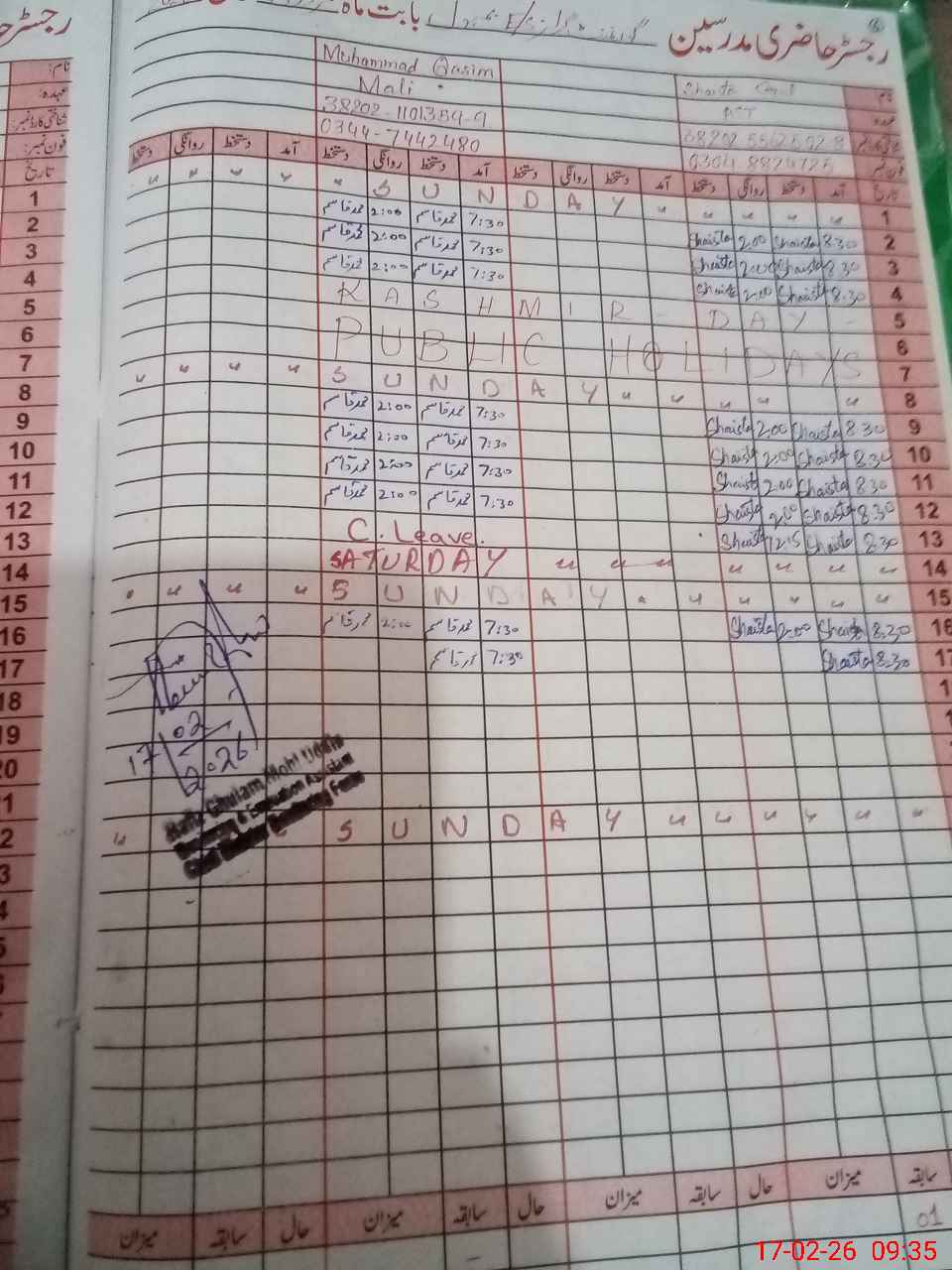 | CNIC | Full Name | Designation | R/C | Absence During Last Calender Month |