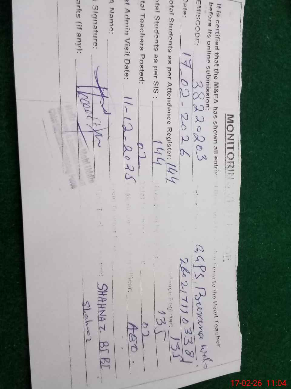 | Certified that this School was Inspected by the Undersigned MEA/DMO Today and the Information Stated Above is as Per Record. | |||||