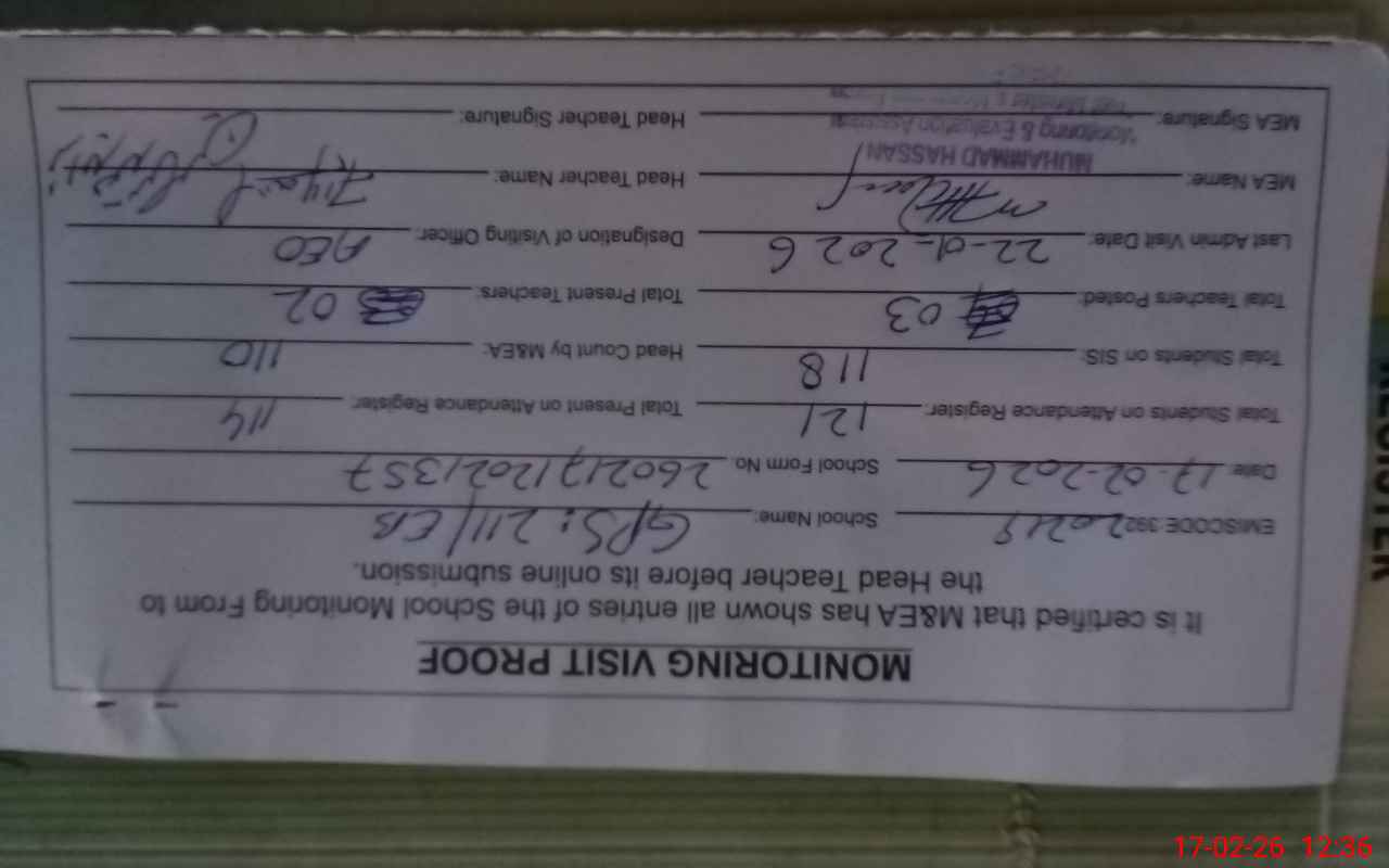| Certified that this School was Inspected by the Undersigned MEA/DMO Today and the Information Stated Above is as Per Record. | |||||