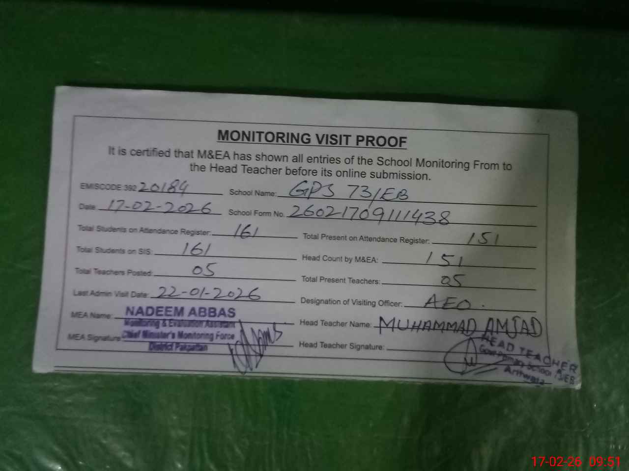 | EMIS Code: 39220184 | Name of School: GPS 73 EB P/O CHAK NO 75/EB | |||