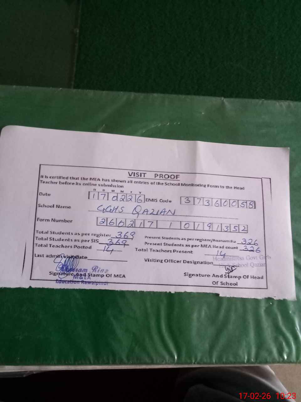 | EMIS Code: 37360058 | Name of School: GGHS QAZIAN | |||