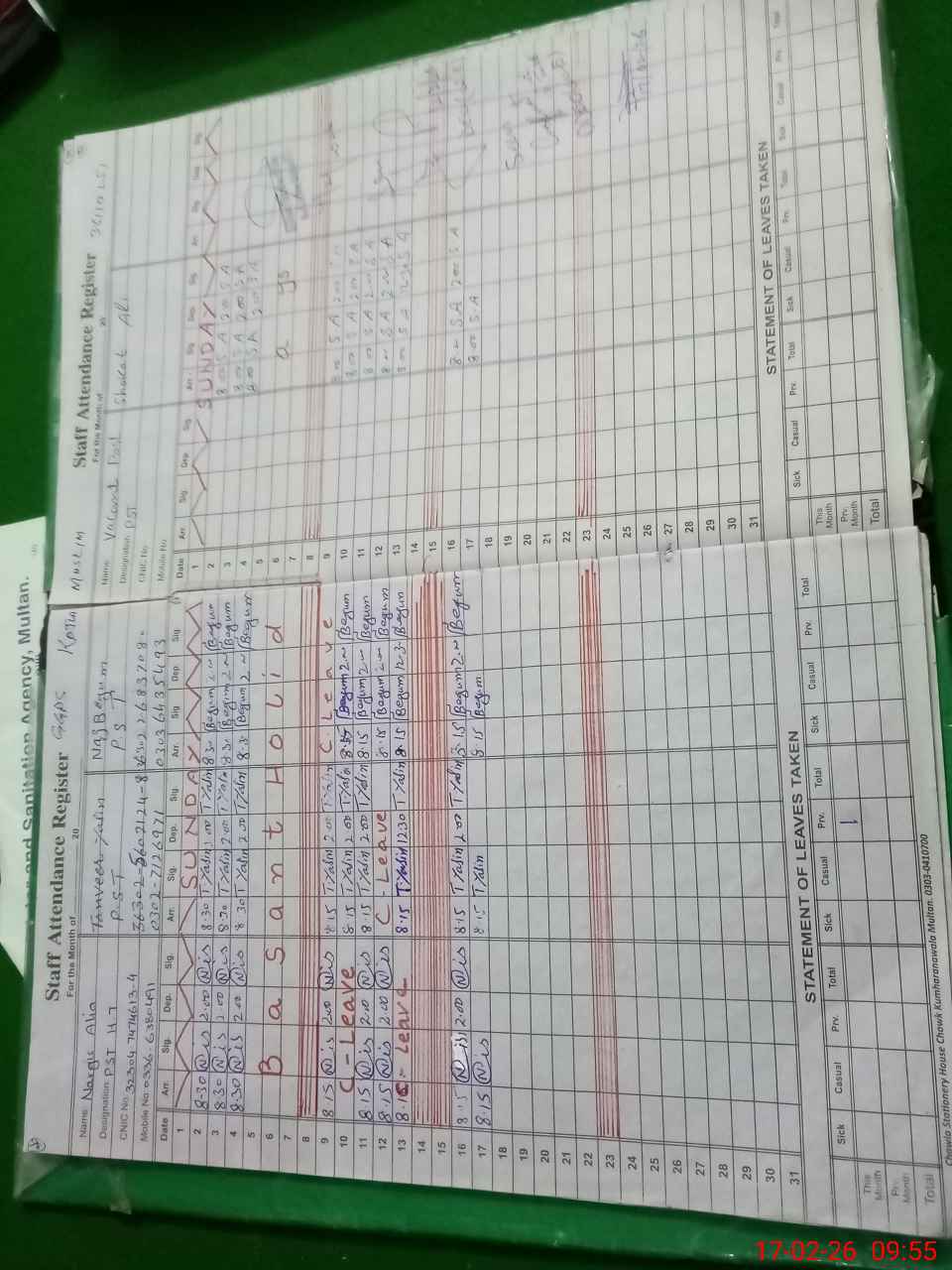 | CNIC | Full Name | Designation | R/C | Absence During Last Calender Month |