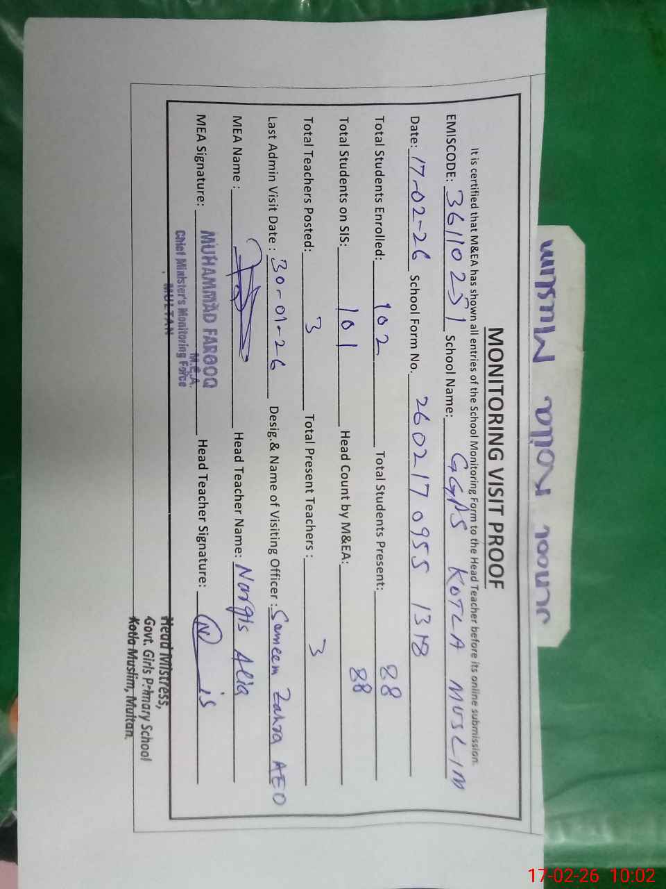 | Certified that this School was Inspected by the Undersigned MEA/DMO Today and the Information Stated Above is as Per Record. | |||||