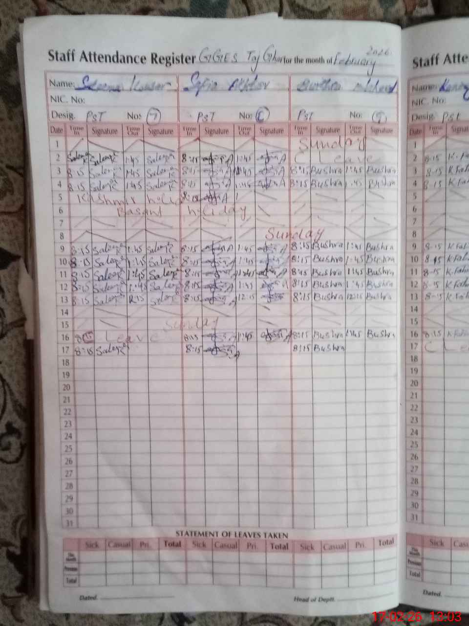 | Leave | Duty | Absent | Maternity | Medical | Ex- Pak |