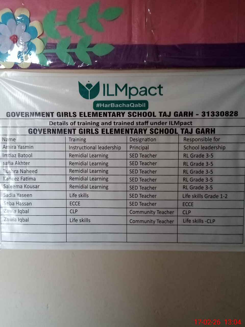 | District: RAHIMYAR KHAN | Tehsil: RAHIMYAR KHAN | Markaz: TAJ GARH-FEMALE | Level: Middle | |