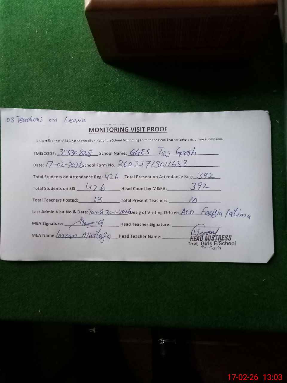 | Attendance Register | Head Teacher | MEA with School | Visit Proof |