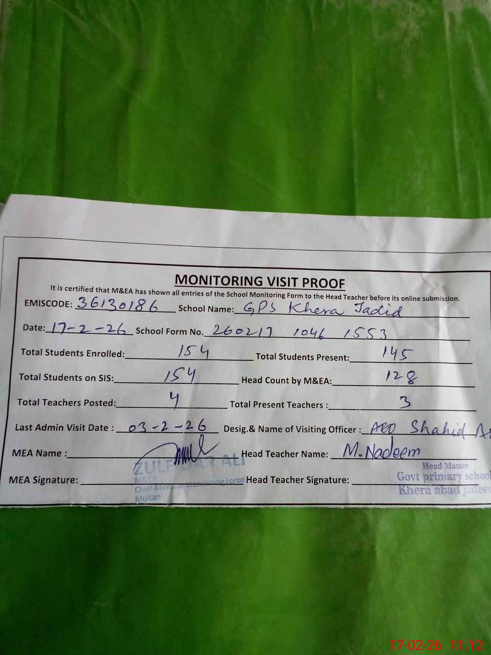 | EMIS Code: 36130186 | Name of School: GPS KHERA ABAD JADID | |||
