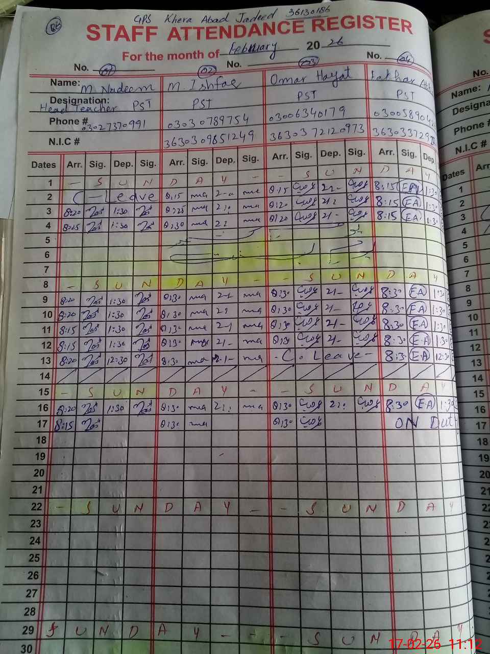| CNIC | Full Name | Designation | R/C | Absence During Last Calender Month |