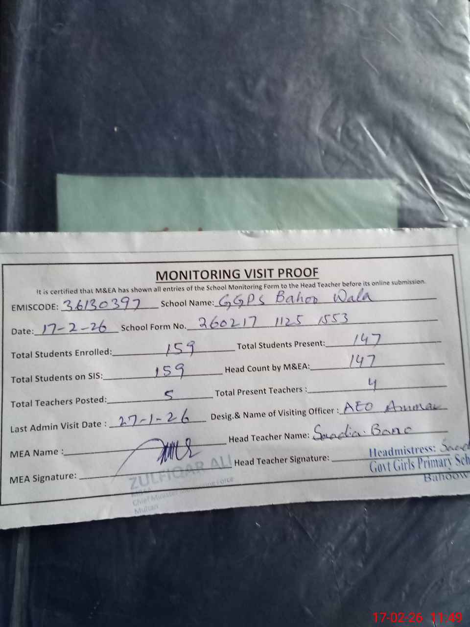 | EMIS Code: 36130397 | Name of School: GGPS BAHOO WALA QADIRPUR RAWAN | |||