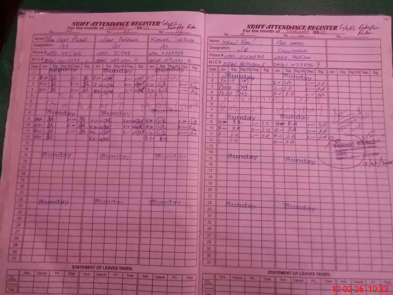 | CNIC | Full Name | Designation | R/C | Absence During Last Calender Month |