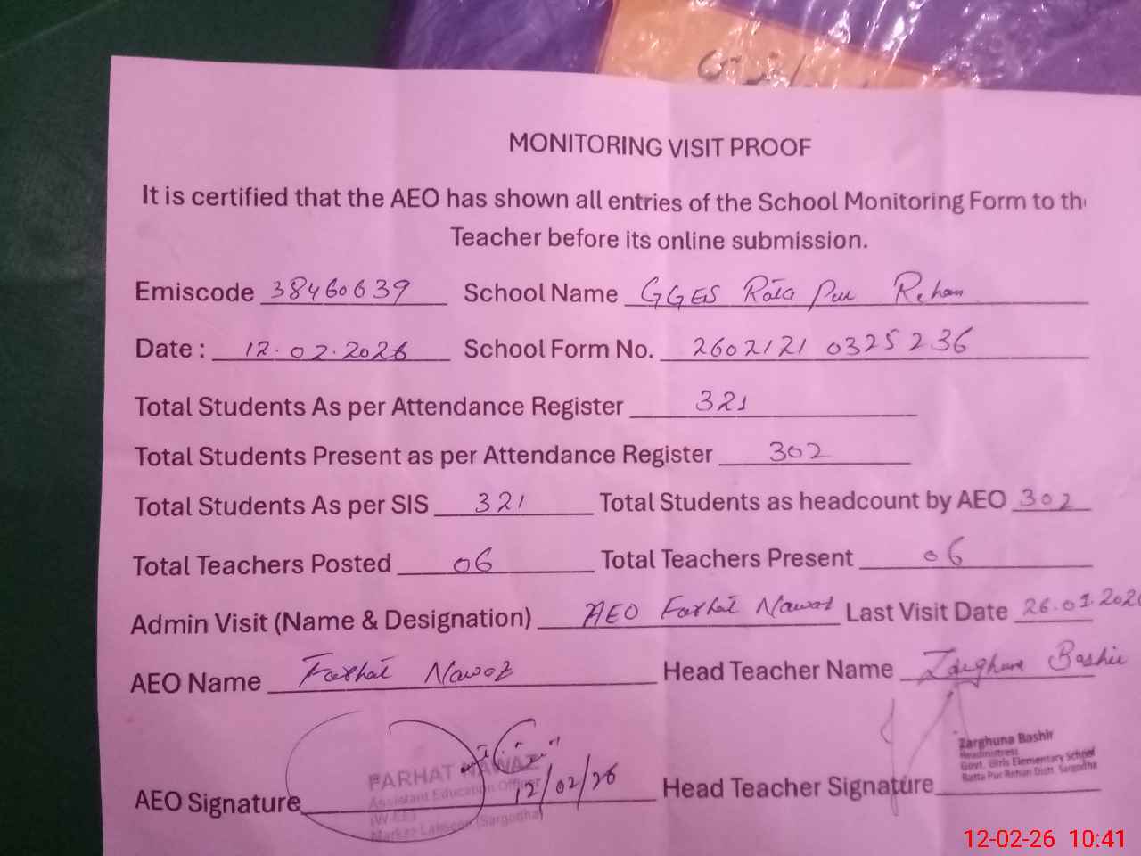 | Attendance Register | Head Teacher | MEA with School | Visit Proof |