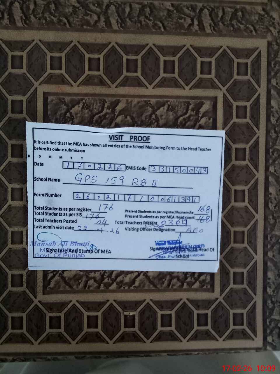 | Certified that this School was Inspected by the Undersigned MEA/DMO Today and the Information Stated Above is as Per Record. | |||||