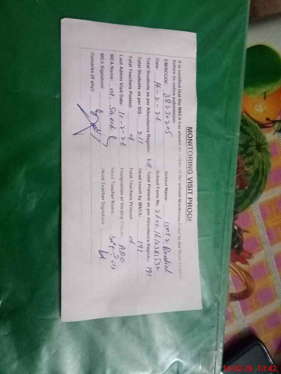| Remarks (Use Separate Page if Required): Students on SIS QTY 211 Last admin visit On 10 February 2026 by AEO | |||||