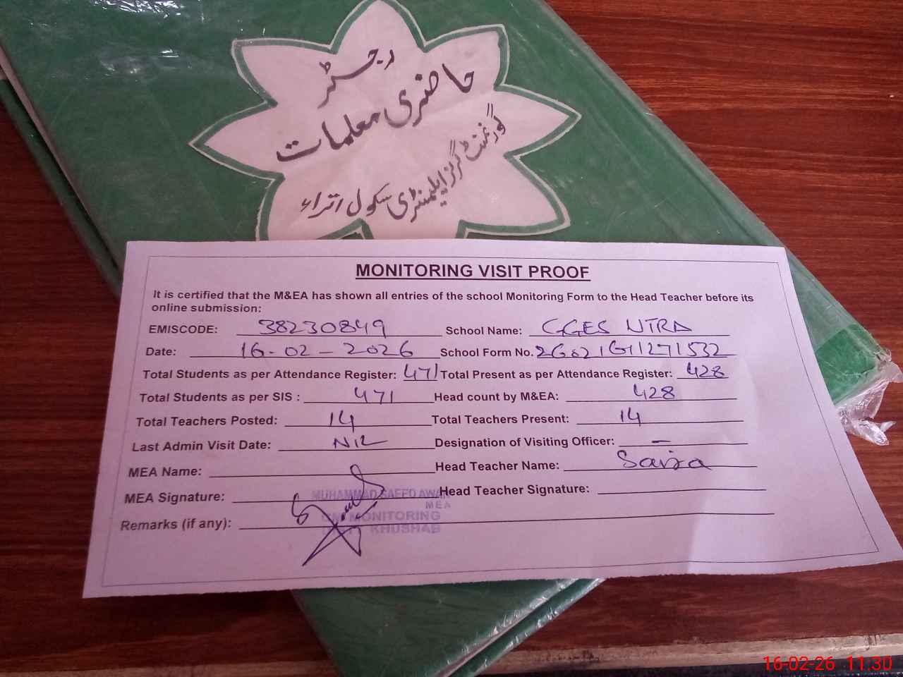 | Attendance Register | Head Teacher | MEA with School | Visit Proof |