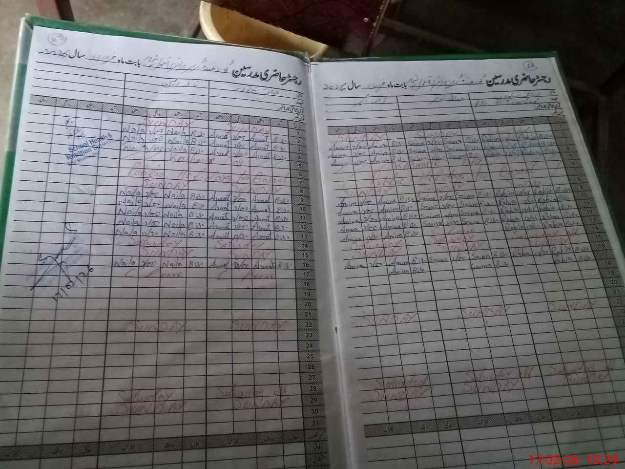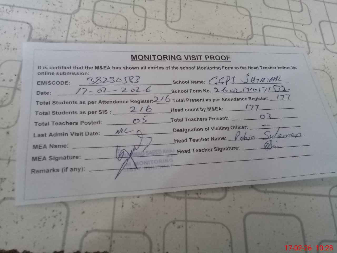 | Attendance Register | Head Teacher | MEA with School | Visit Proof |