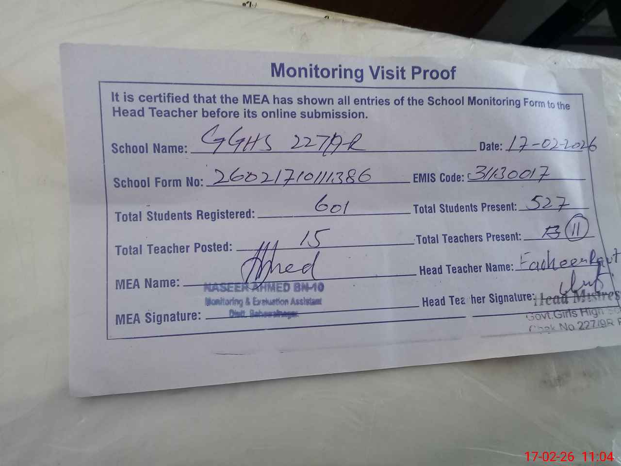 | EMIS Code: 31130017 | Name of School: GGHS CHAK NO.227/9-R | |||