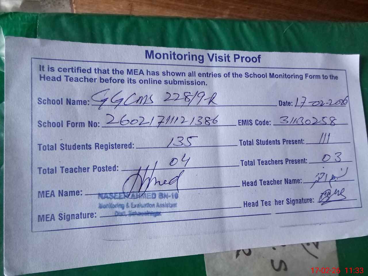 | Attendance Register | Head Teacher | MEA with School | Visit Proof |