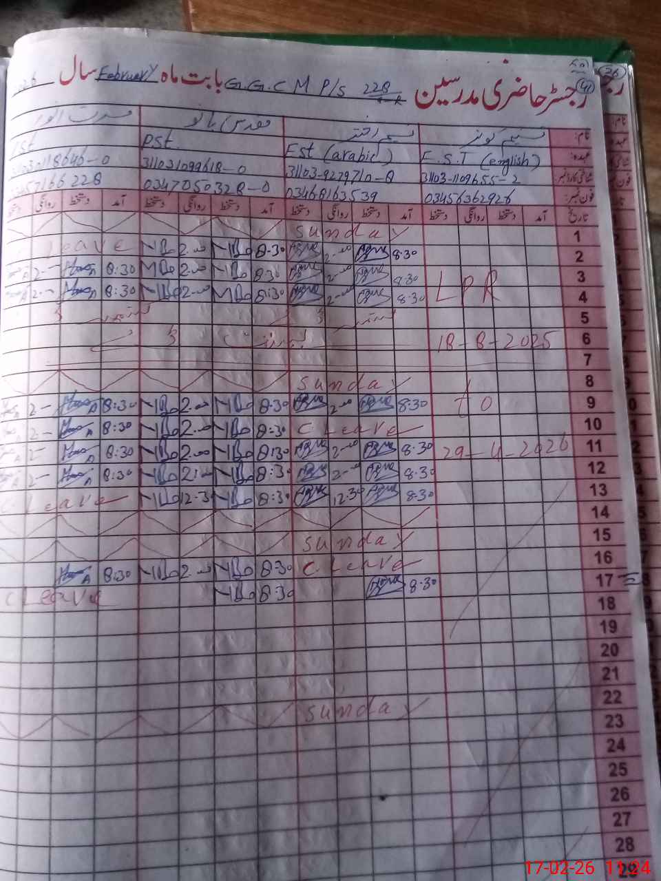 | CNIC | Full Name | Designation | R/C | Absence During Last Calender Month |
