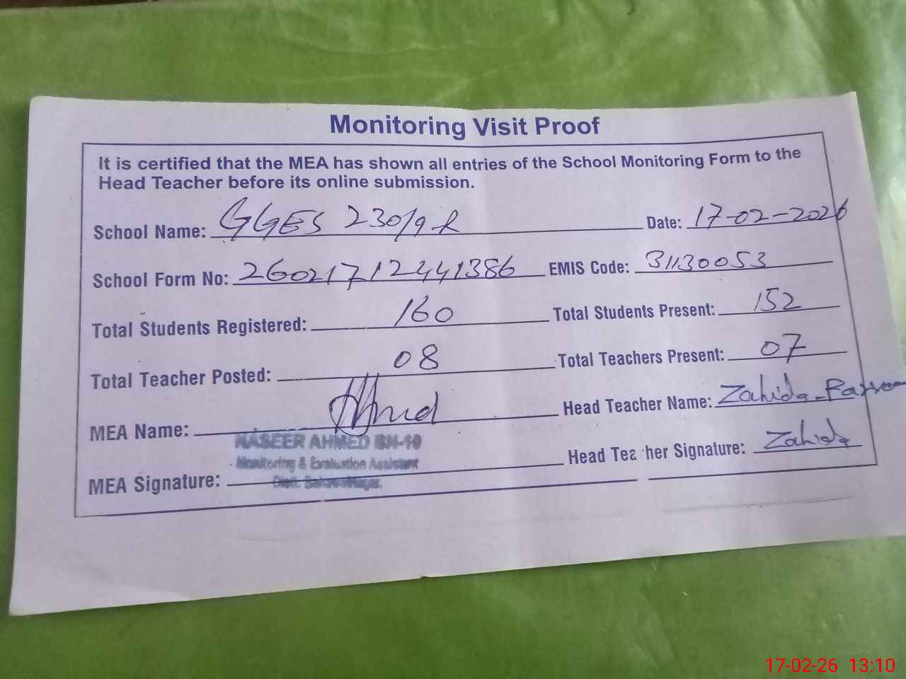 | Attendance Register | Head Teacher | MEA with School | Visit Proof |