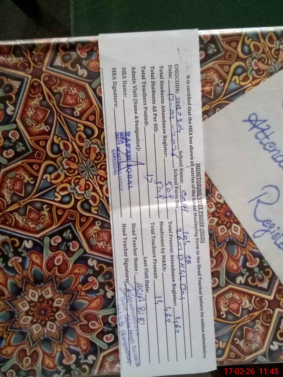 | Attendance Register | Head Teacher | MEA with School | Visit Proof |