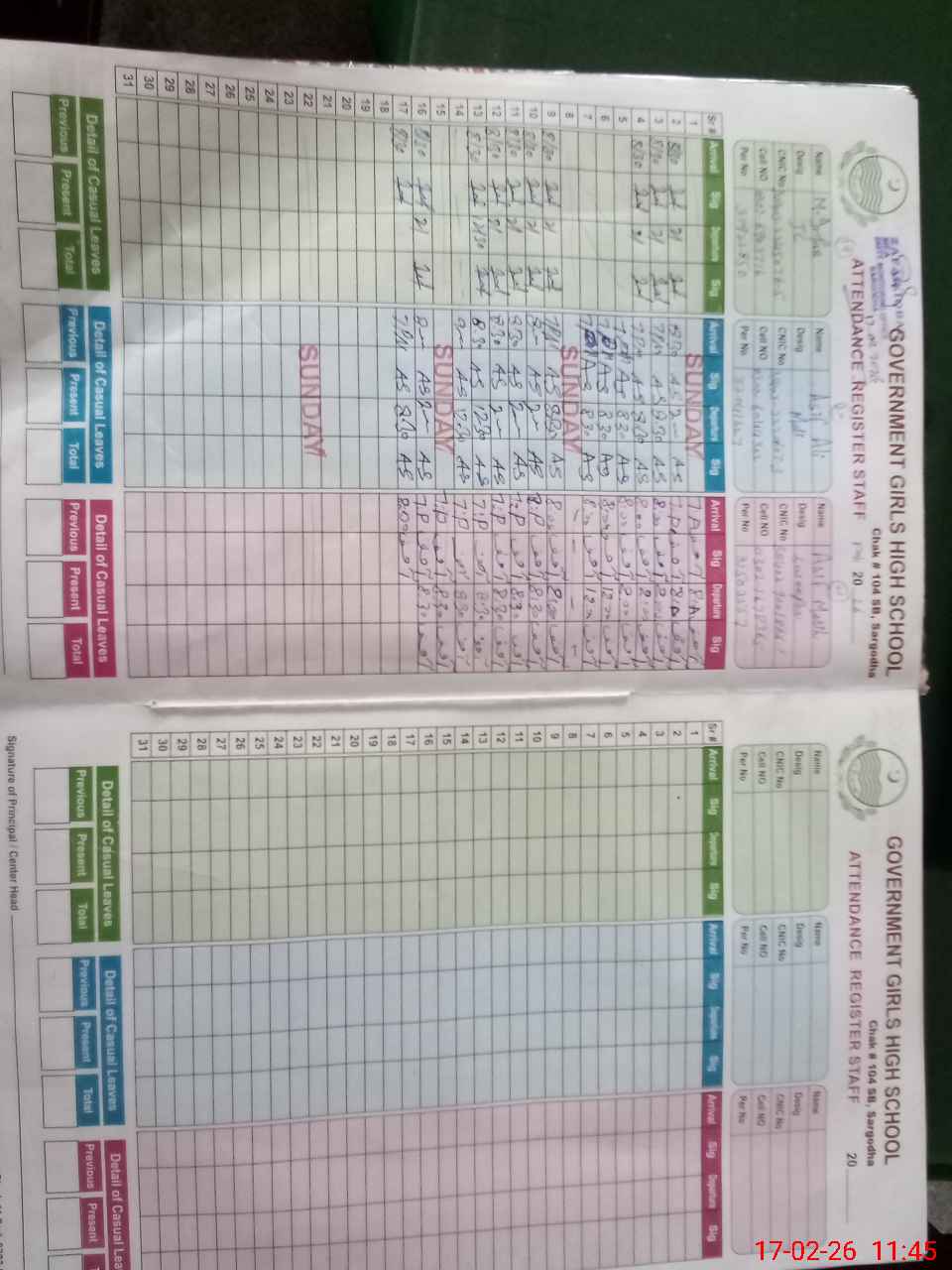 | CNIC | Full Name | Designation | R/C | Absence During Last Calender Month |