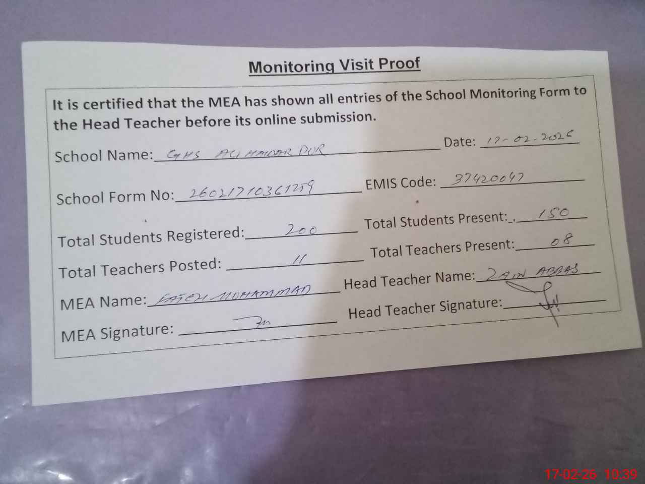 | Attendance Register | Head Teacher | MEA with School | Visit Proof |