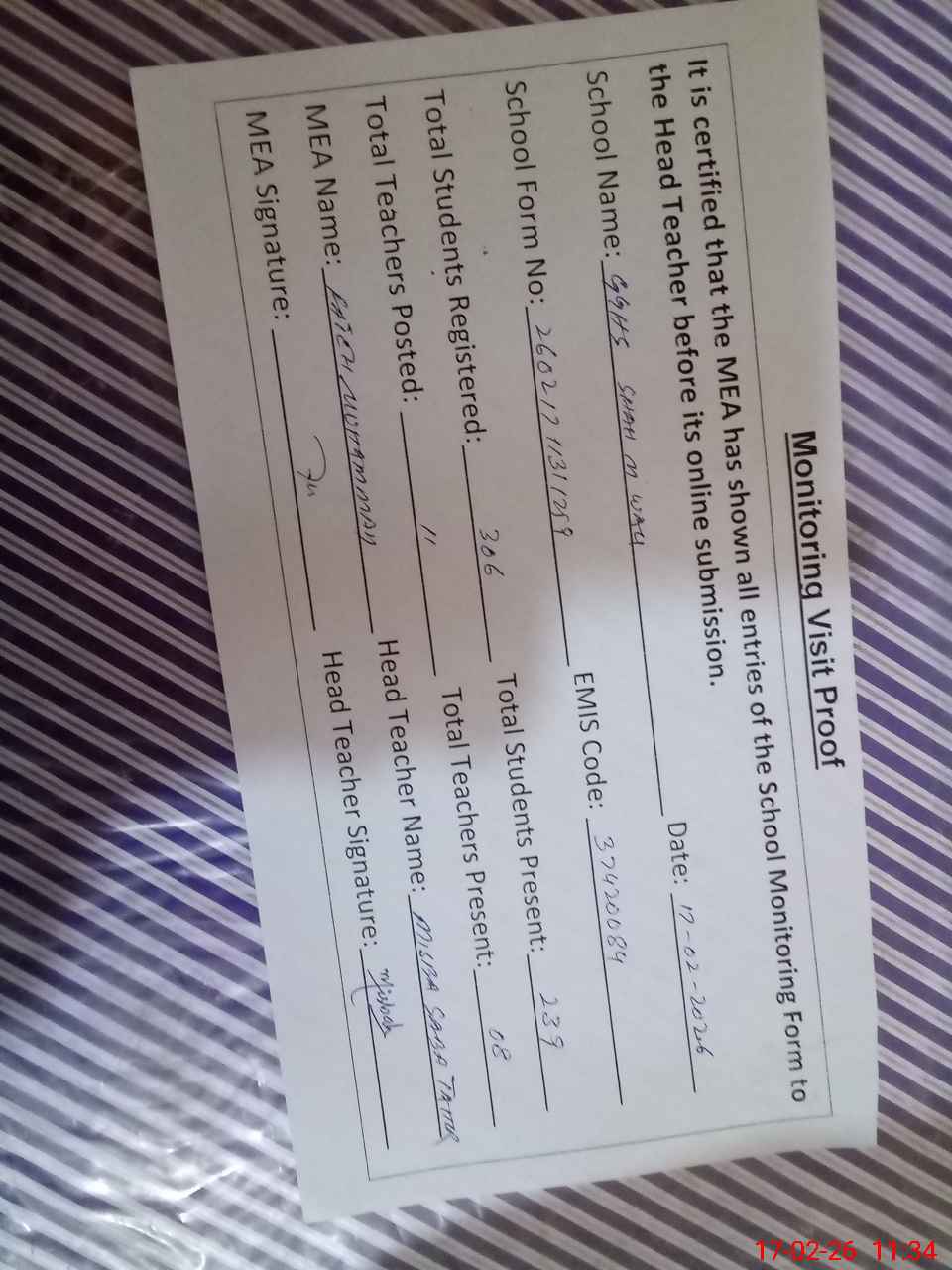 | Attendance Register | Head Teacher | MEA with School | Visit Proof |