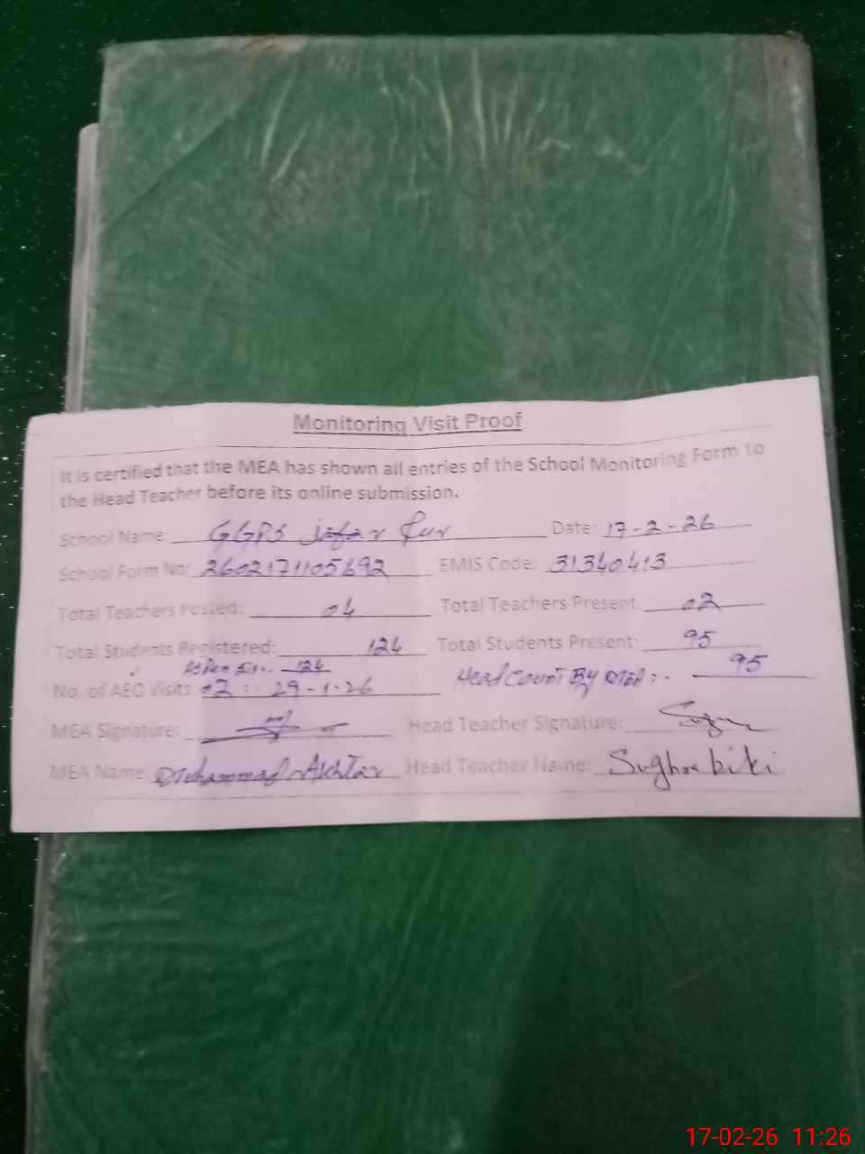 | Attendance Register | Head Teacher | MEA with School | Visit Proof |