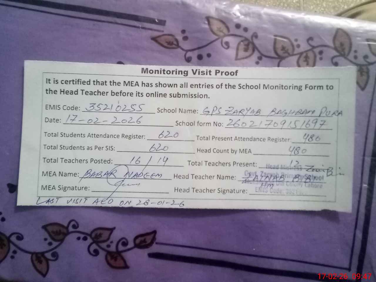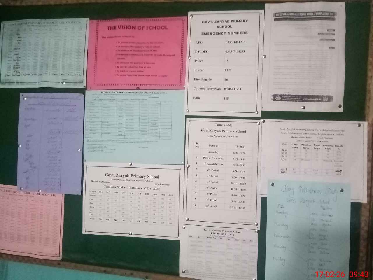 | EMIS Code: 35210255 | Name of School: GPS ZARYAB BAGHBANPURA LAHORE | |||