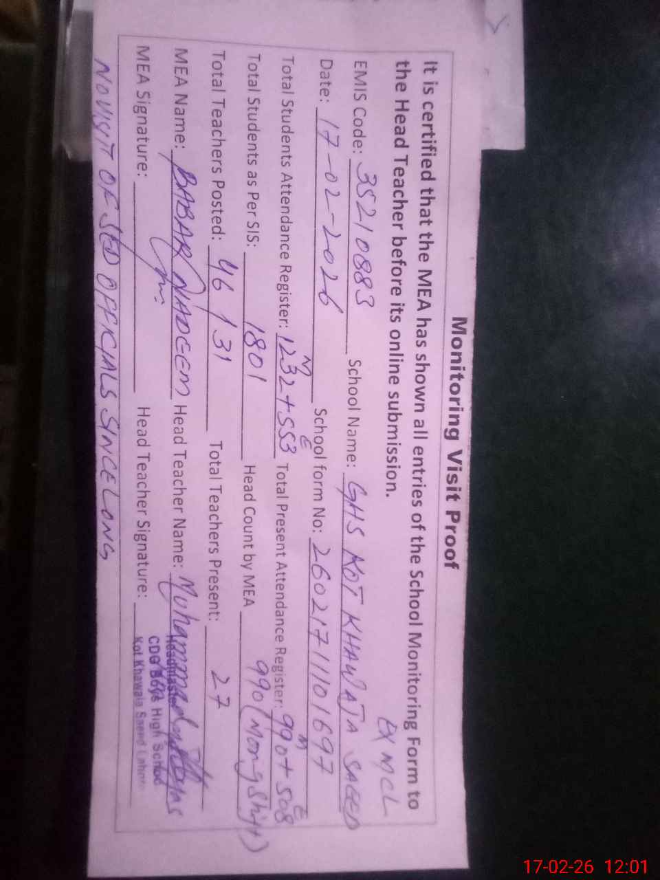 | EMIS Code: 35210883 | Name of School: GHS KOT KHAWAJA SAEED (EX-MCL) | |||