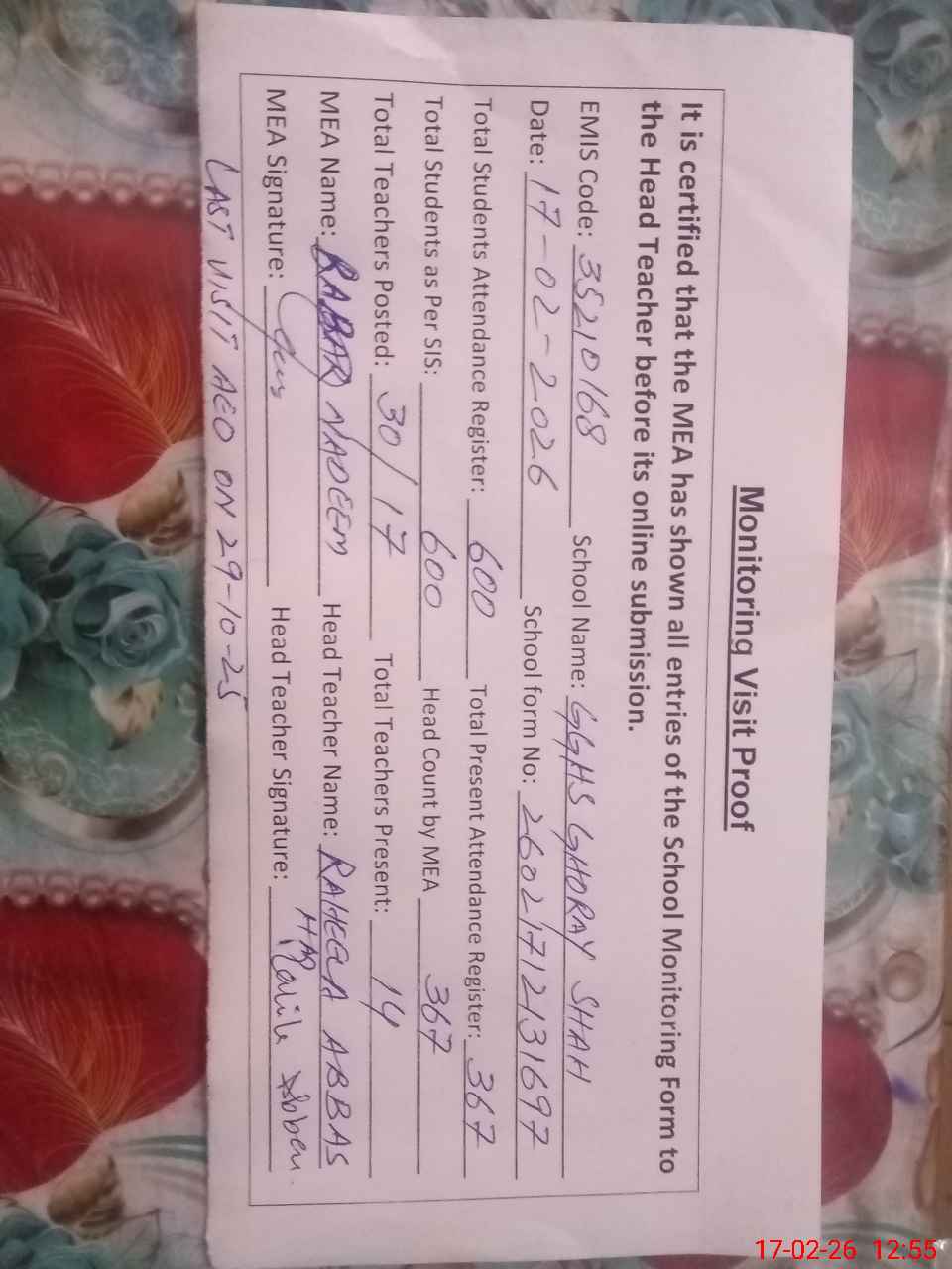 | EMIS Code: 35210168 | Name of School: GGHS GHORAY SHAH(Newly upgraded) | |||