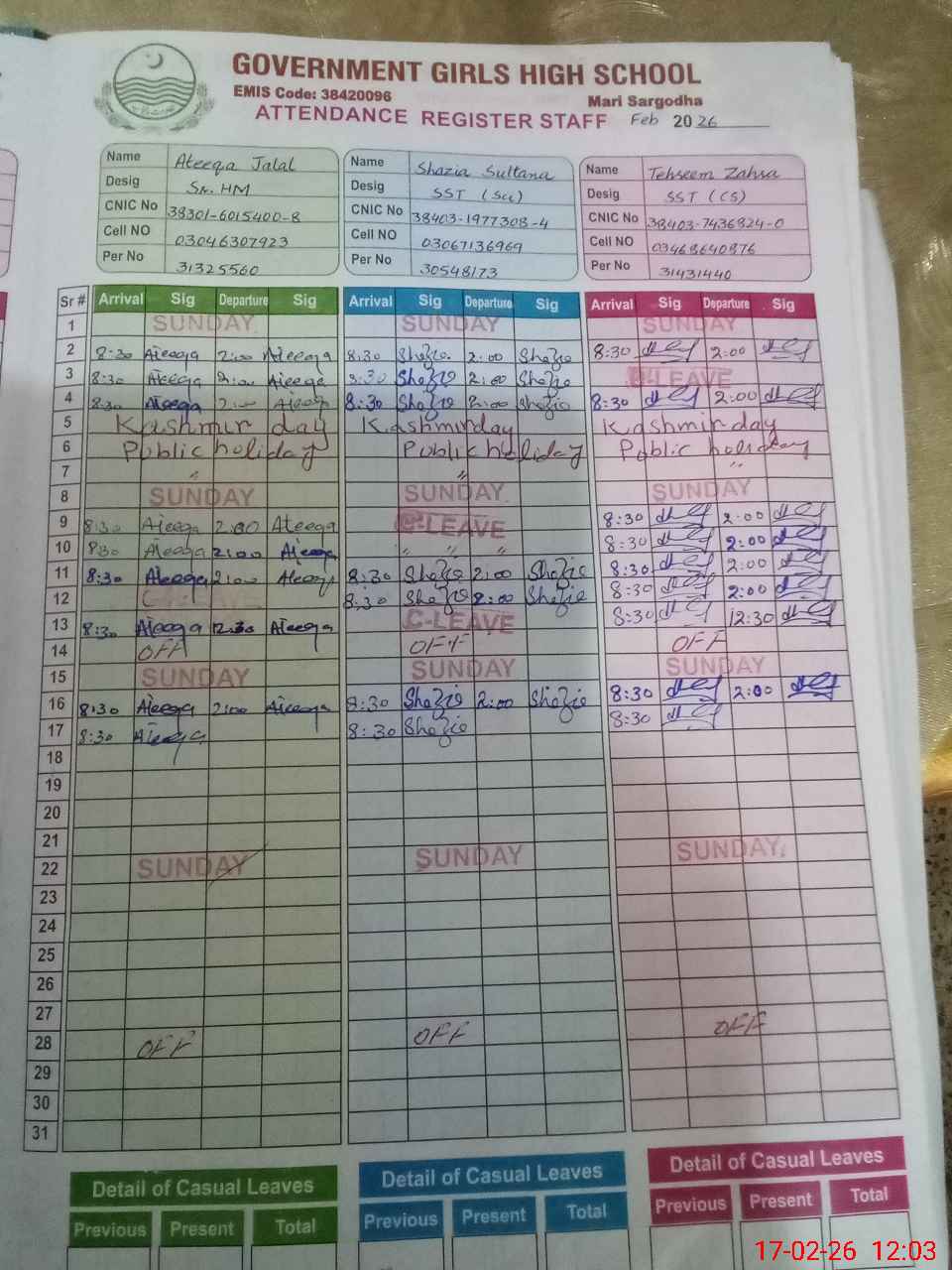 | CNIC | Full Name | Designation | R/C | Absence During Last Calender Month |