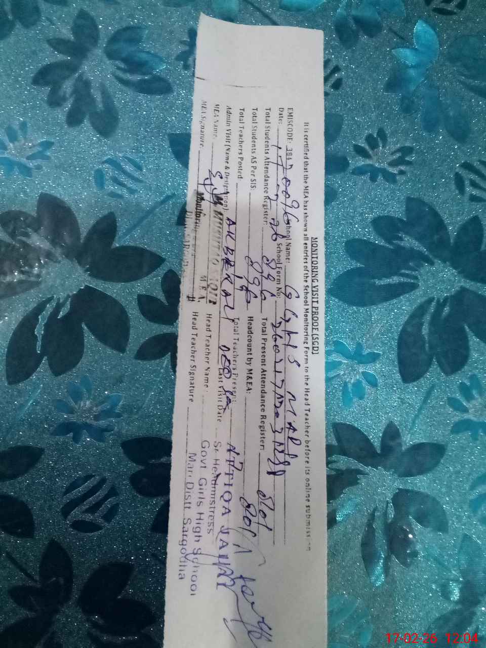 | Name: At**** Ja**** Designation: (School Headmaster's/Headmistress's) Sr. HEADMISTRESS Phone/Cell Number: 03**** |