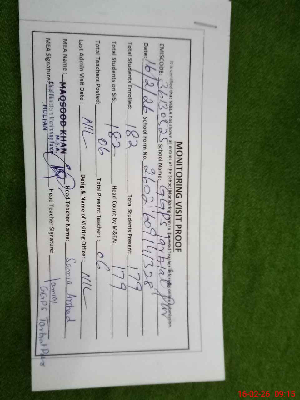 | Certified that this School was Inspected by the Undersigned MEA/DMO Today and the Information Stated Above is as Per Record. | |||||