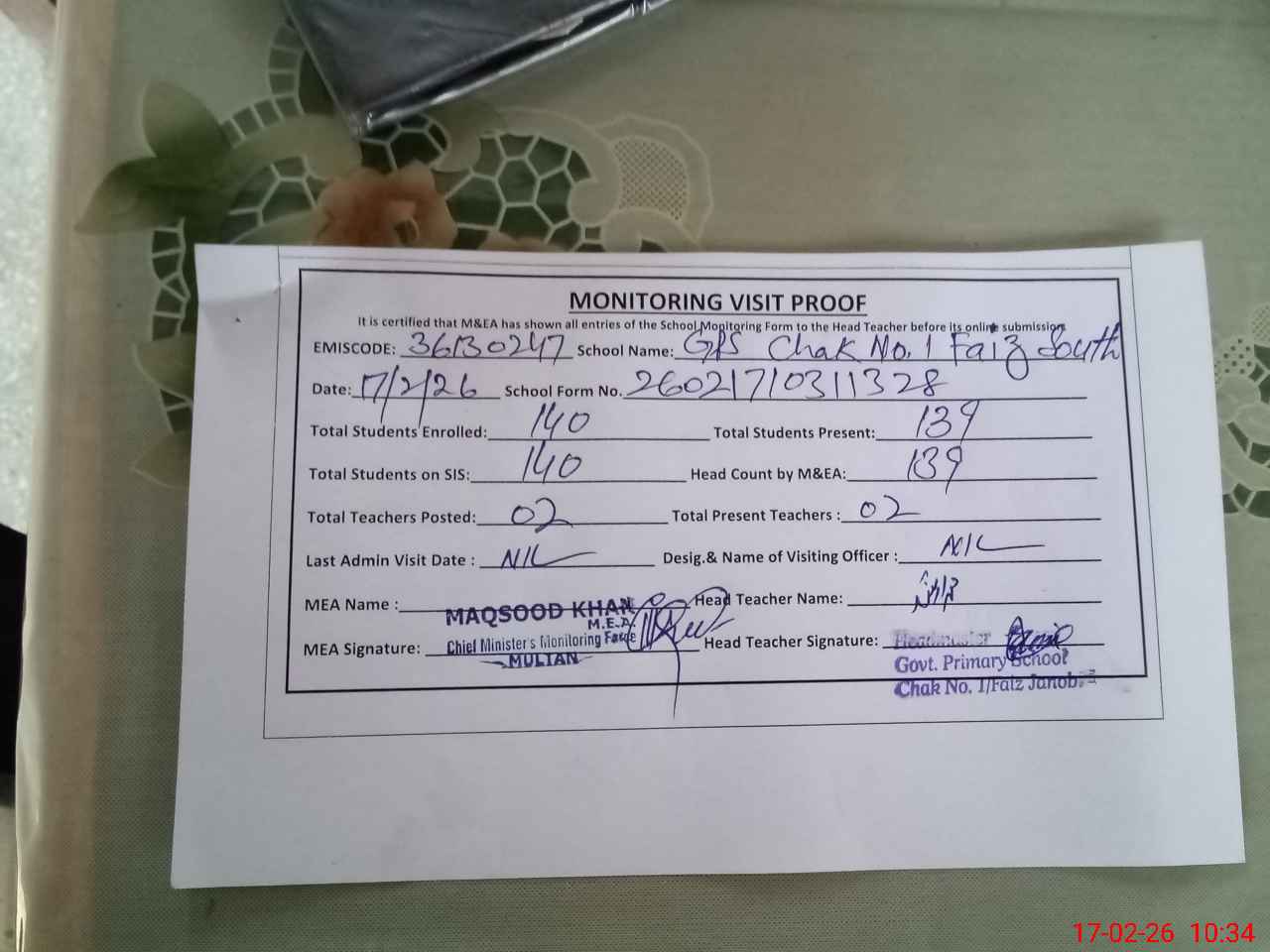 | EMIS Code: 36130247 | Name of School: GPS CHAK NO. 1 FAIZ SOUTH | |||