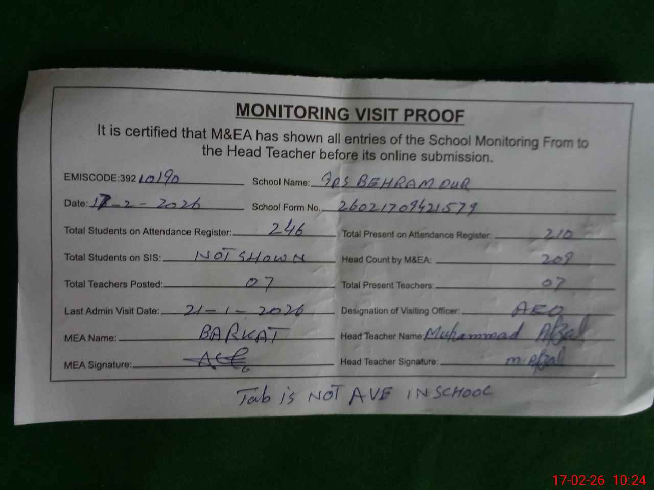 | Attendance Register | Head Teacher | MEA with School | Visit Proof |
