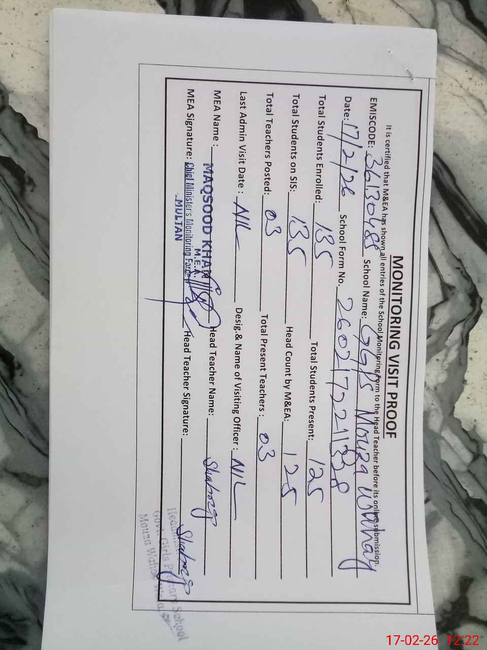 | Certified that this School was Inspected by the Undersigned MEA/DMO Today and the Information Stated Above is as Per Record. | |||||