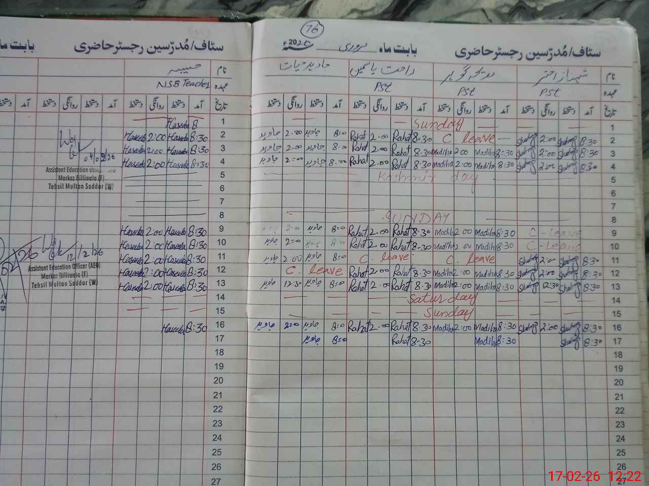 | CNIC | Full Name | Designation | R/C | Absence During Last Calender Month |