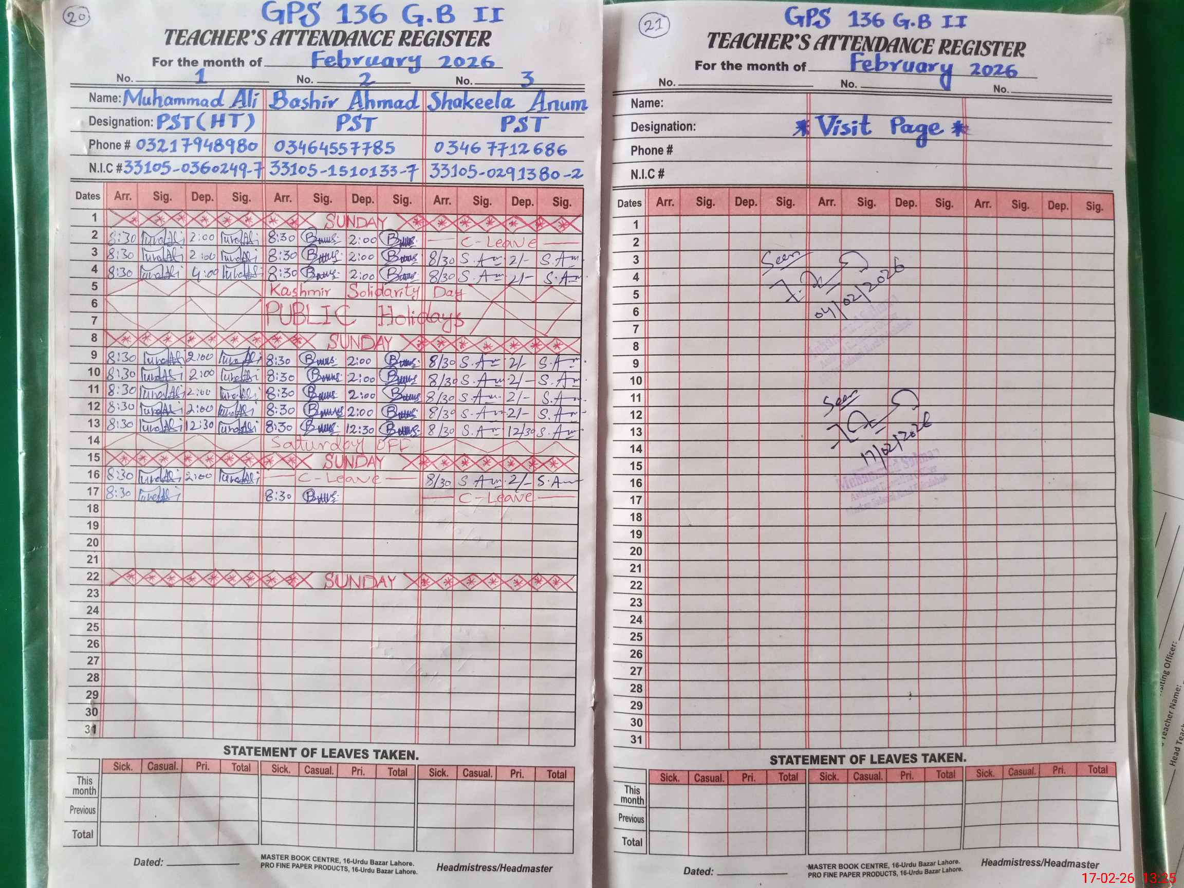 | Name: MU**** AL**** Designation: (School Headmaster's/Headmistress's) PST Phone/Cell Number: 03**** |