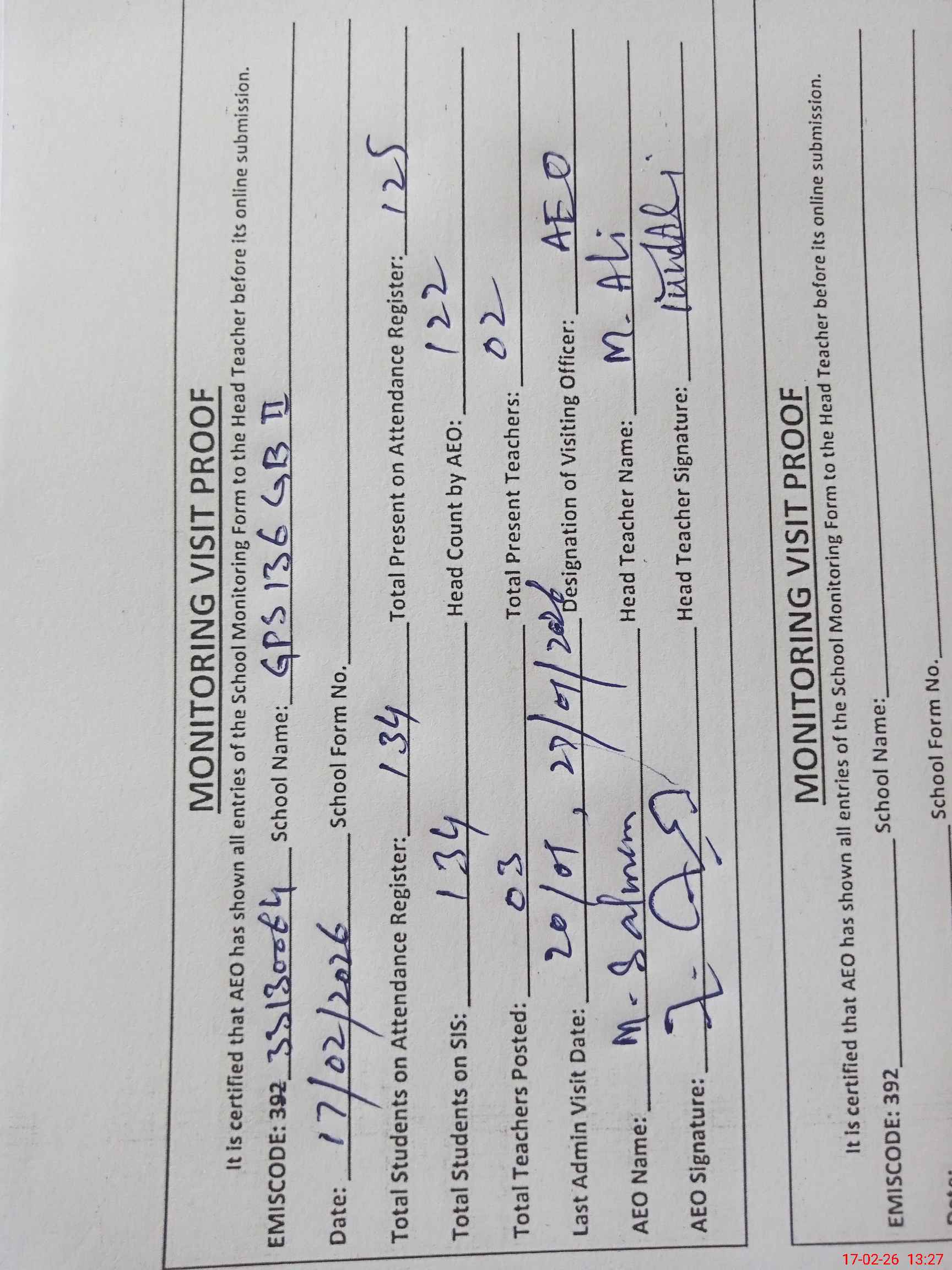 | Attendance Register | Head Teacher | MEA with School | Visit Proof |