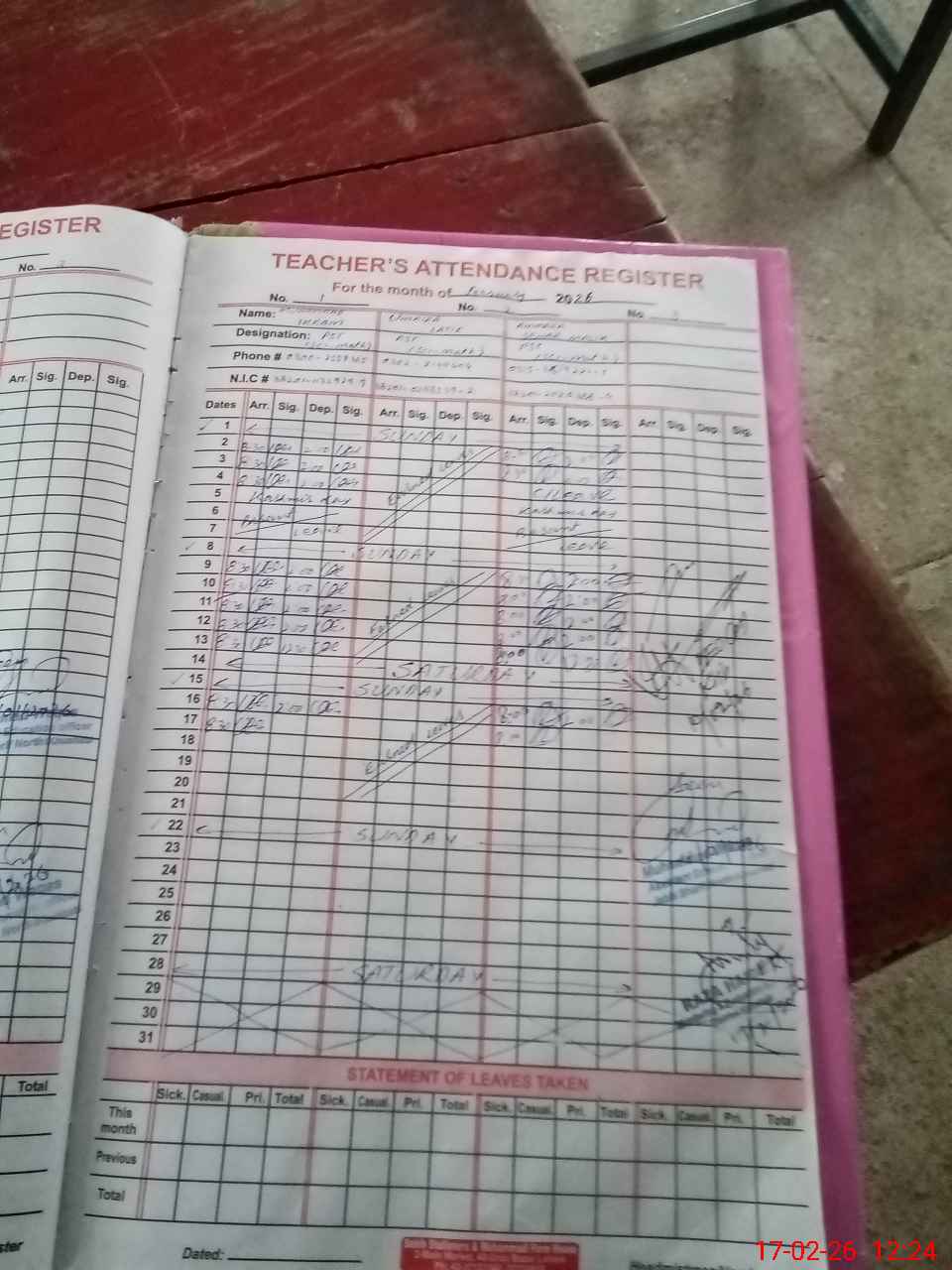 | CNIC | Full Name | Designation | R/C | Absence During Last Calender Month |