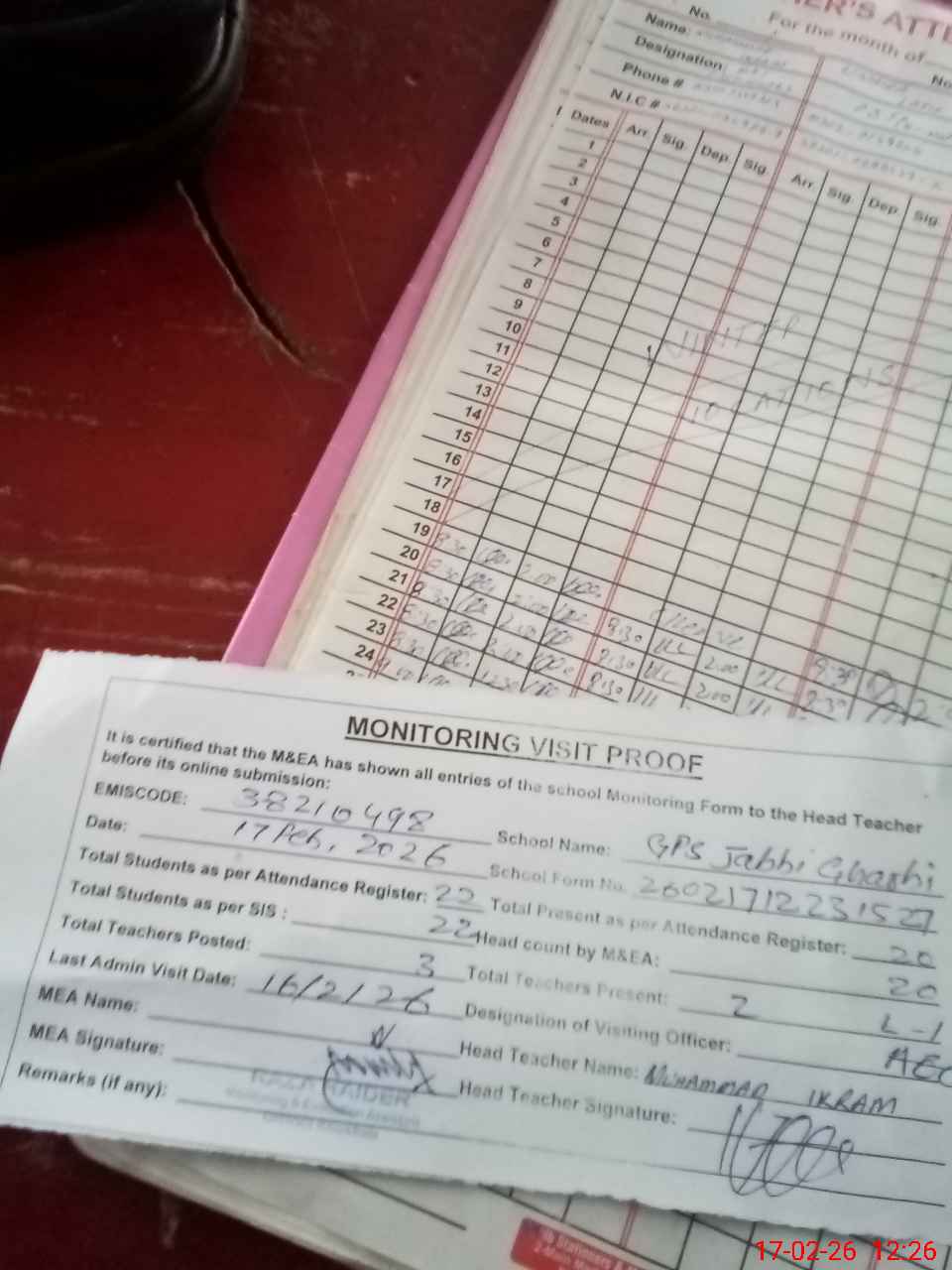 | Attendance Register | Head Teacher | MEA with School | Visit Proof |