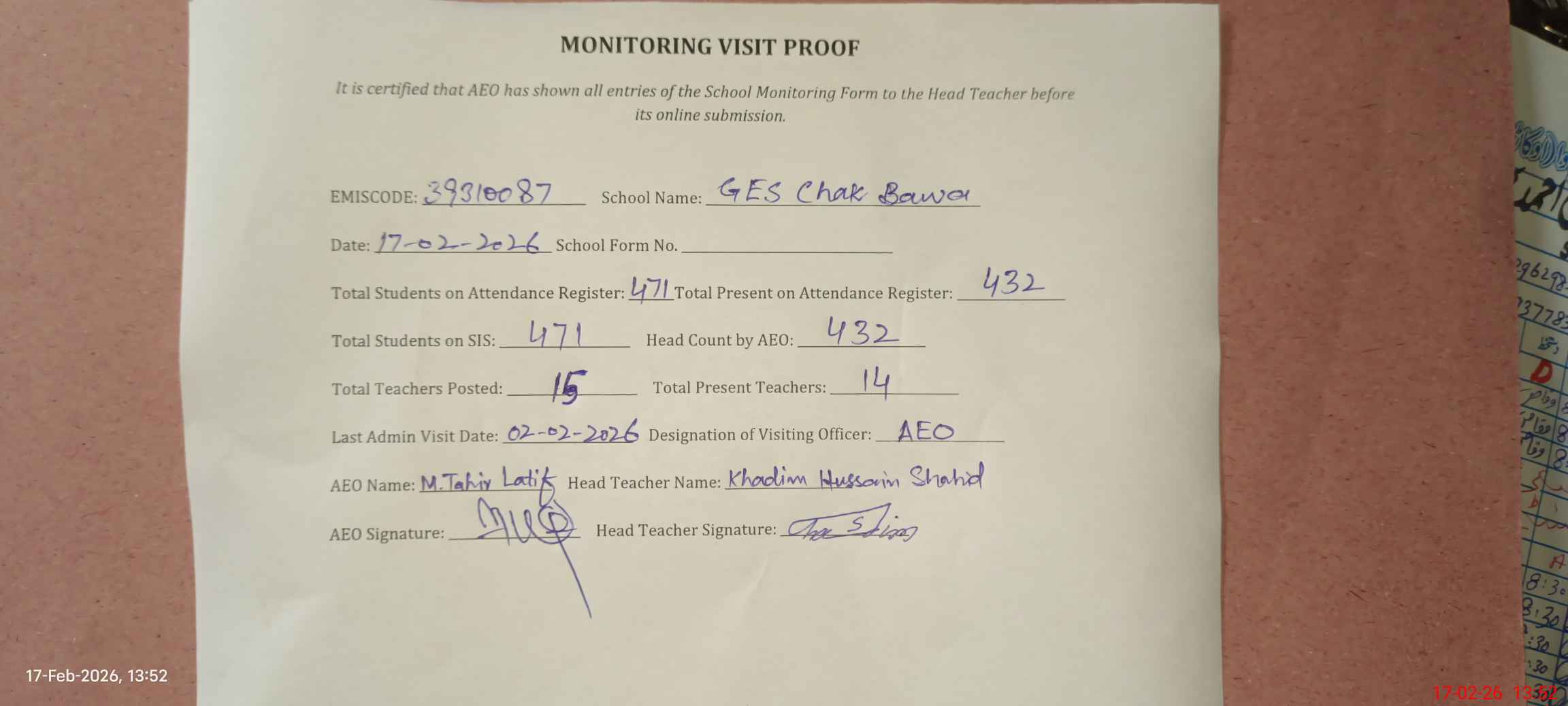 | Certified that this School was Inspected by the Undersigned MEA/DMO Today and the Information Stated Above is as Per Record. | |||||